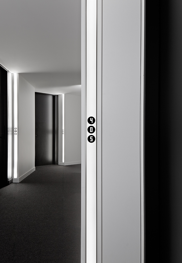 LED in wall Foyer lighting and corridor lighting, calculated for general way finding lighting. Bluelab Design worked extensively to model the public lighting so that no additional lighting was needed and the striking feature would remain the hero. Corridor lighting included number decals for apartment numbers. Similarly the exterior balconies had custom exterior linear lighting mounted to the walls creating a lighting feature by night.