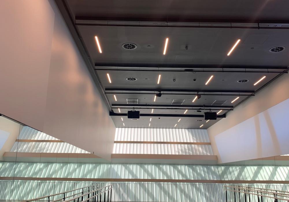 The Dance studios are flooded with natural daylight coupled with high ceiling they are beautiful creative spaces. The lighting had to be high output to create efficient lighting mounted on a high ceiling. the linear luminaires are recessed into the ceiling with a custom powder coat finish to blend in.