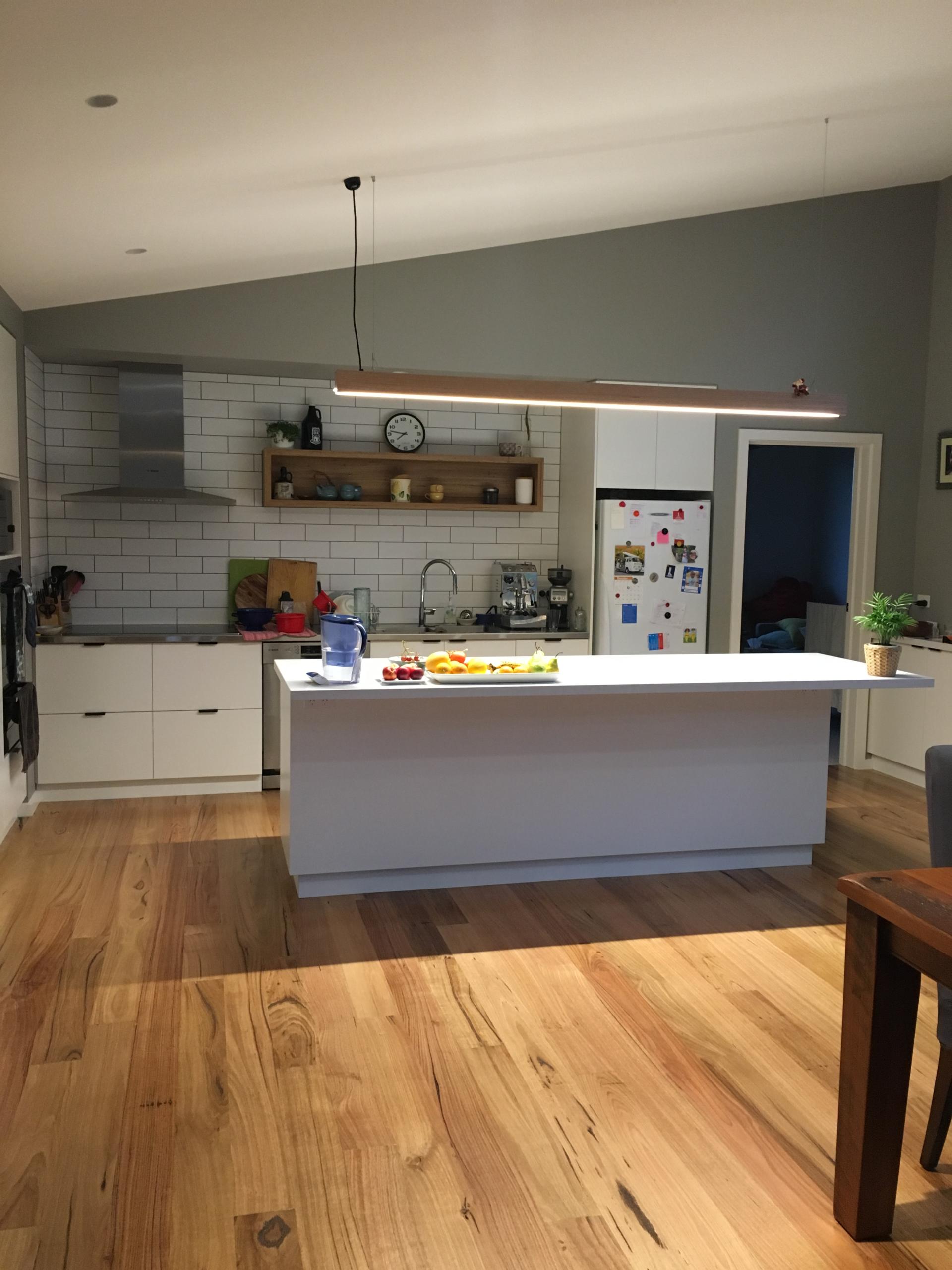 The Ocean Grove home added the warm timber pendant to provide a contrast to the clean white surfaces in their new kitchen. The T965 being slim and sleek manufactured at 2290mm matching the bench top provide ample light with the continuous LED PCB’s and micro prism LED diffusers. The Truss range provide beautiful lighting for kitchens with continuous energy efficient LED lighting, the even illumination is perfect for cooking and entertaining.
